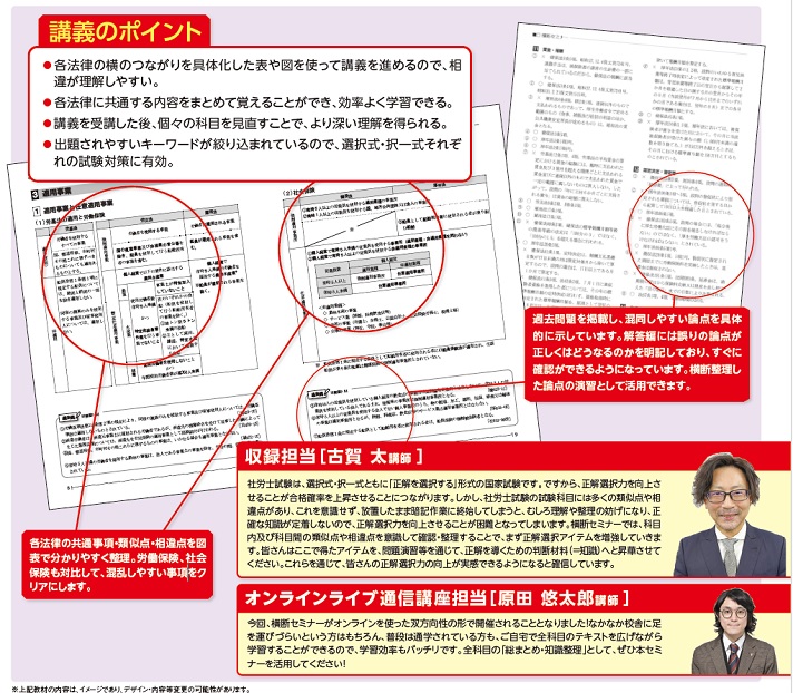 社労士試験が難しいといわれる要因の一つは、同じ言葉で括られる論点であっても、科目によって内容が異なることにあります。そこで「横断セミナー」では、各法律を横断して、① 類似する事項の相違点を明確にする ② 共通する事項をまとめること により、混乱しがちな論点を整理していきます。整理して、まとめて覚えることにより、学習時間を短縮し、効率的に理解を深めていただくことができます。