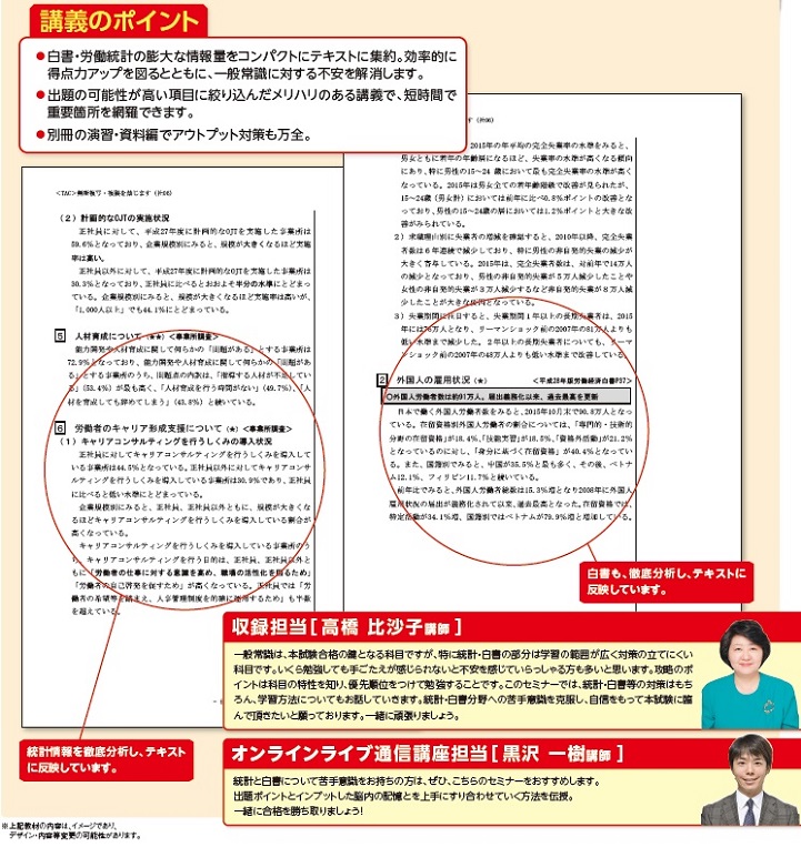 統計・白書が出題される「一般常識」という科目は、「労務管理その他の労働に関する一般常識」と「社会保険に関する一般常識」に大別され、その範囲が膨大であるため、苦手に感じている受験生が多い科目の一つです。本セミナーは全2回にわたり試験対策という観点から、白書に記載される最新の統計資料の内容はもちろん、出題頻度の高い箇所を厳選してズバリ指摘していきます。