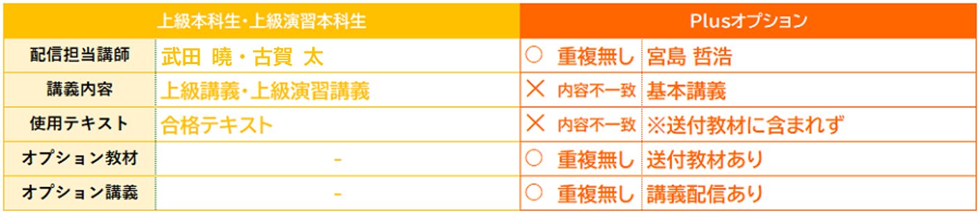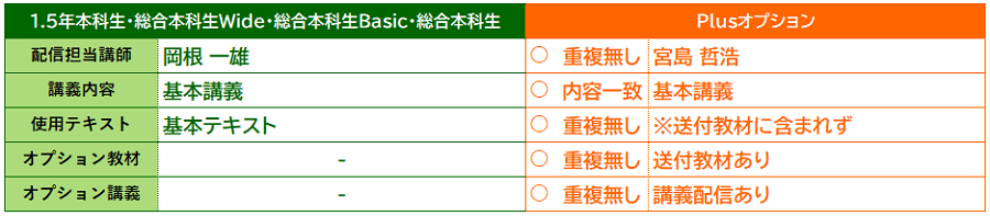 1.5年本科生・総合本科生Wide・総合本科生Basic・総合本科生をご受講の方⇒Plusオプション 〇