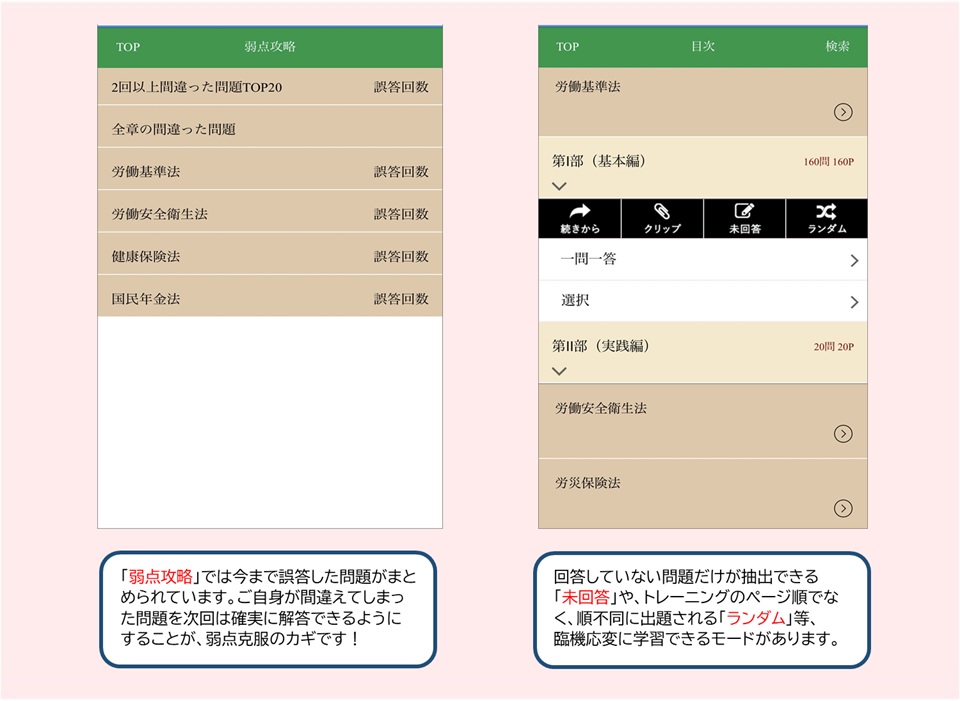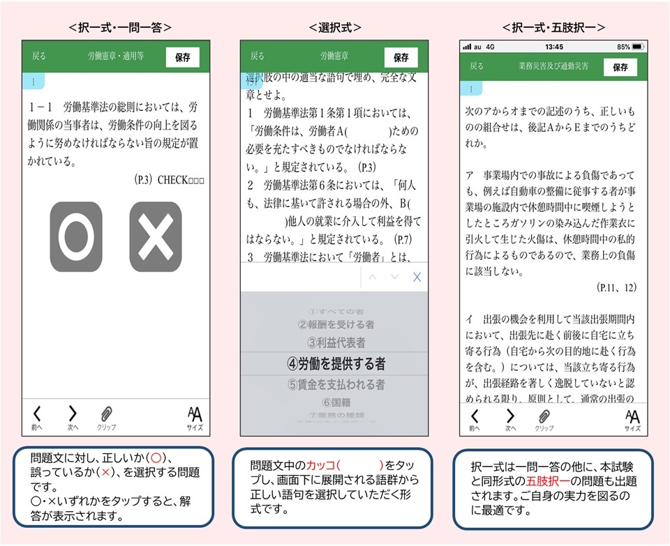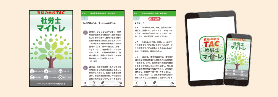 「トレーニング」「過去10年本試験問題集」の問題をスマホやタブレットでも解くことができます。外出時、電車内や休憩中などを使って利用できるので学習効率がUPします。