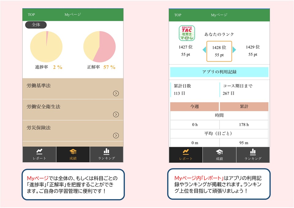 問題の解答数や正答率で進捗を常に確認することができます。