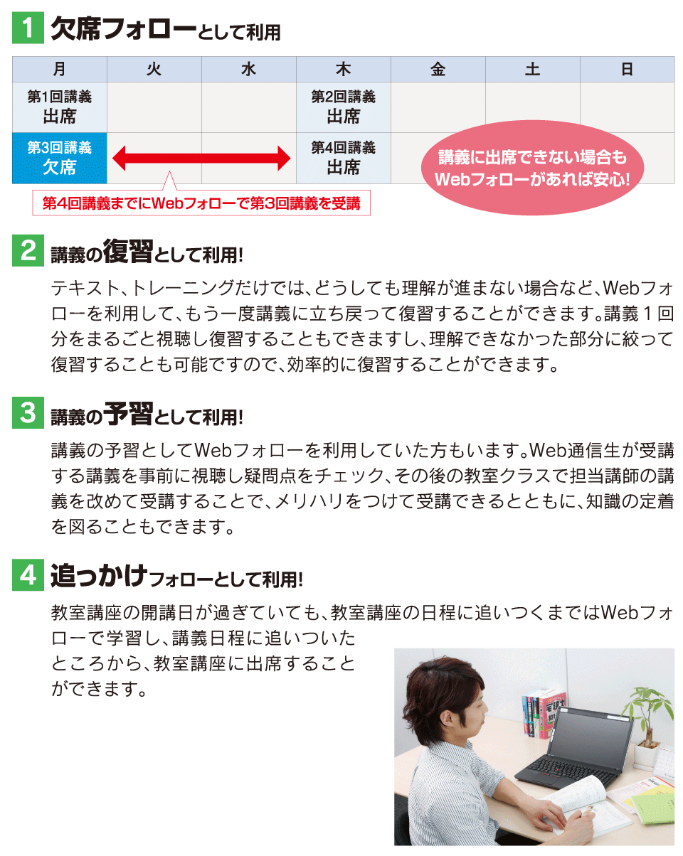 Webフォローは教室講義を収録したデジタル映像データをインターネットから視聴できます。もちろん、講義録(講義中の板書)もPDFデータでアップしていますので、板書をノートに写す手間も省くことができ、講義に集中できます。講義を休んだ場合のフォローや予習・復習にも使え、いつでも、どこでも効率よく学習することができます。通勤・通学時などのわずかな時間の学習用に大変便利です。