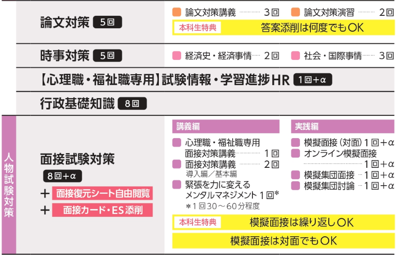 地方上級試験(心理職・福祉職)と法務省専門職、家庭裁判所調査官を幅広く併願できるコースです。教養(基礎能力)試験対策と専門試験対策はもちろん、論文試験対策や人物試験対策も含まれていますので、総合的な受験対策ができます。