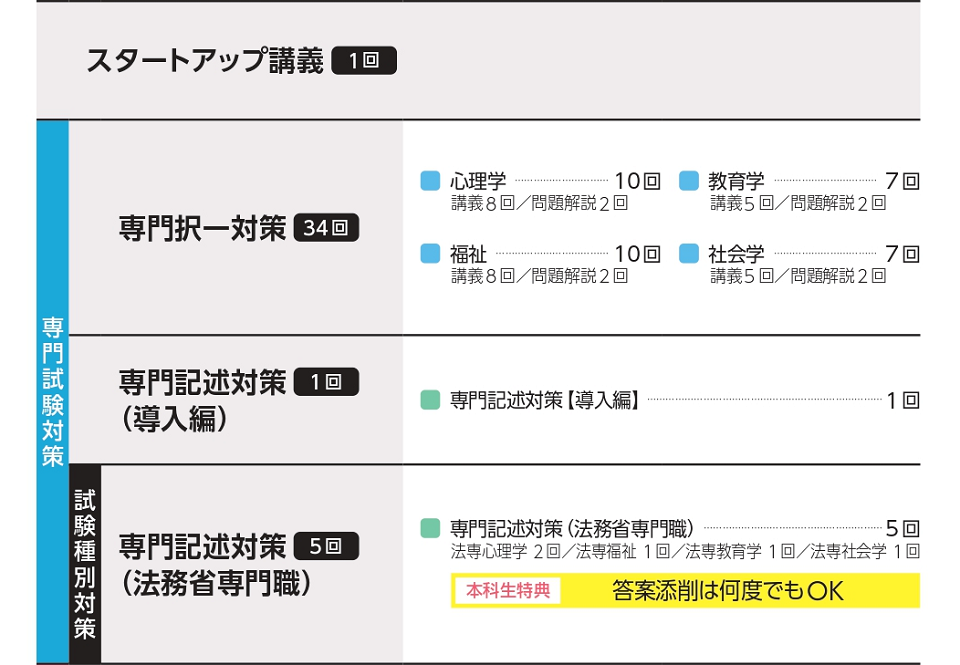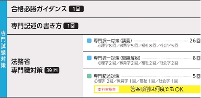 法務省専門職(人間科学)を目指す方向けのコースです。法務省専門職専用の専門記述対策も含まれており、万全の対策を行うことができます。