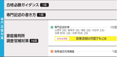 家庭裁判所調査官を目指す方向けのコースです。家庭裁判所調査官専用の専門記述対策も含まれており、万全の対策を行うことができます。