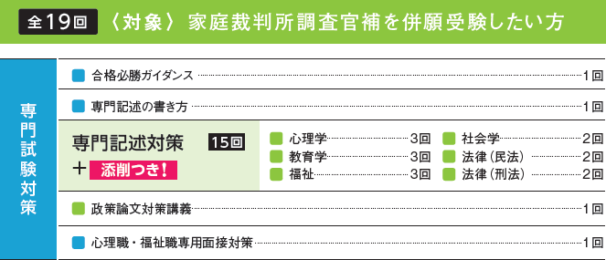 家庭裁判所調査官補試験に必要な専門科目・政策論文・面接の対策講義のみをコンパクトにまとめたコースです。