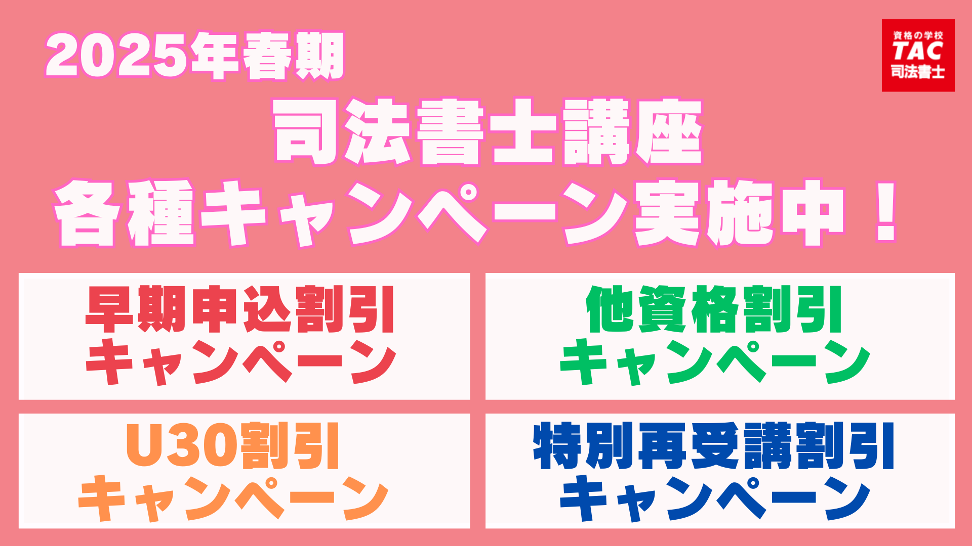 TAC取扱代理店(大学生協・書店等)割引、NEXT割引、日商ステップアップ割引、株主優待割引券、法人割引のいずれか1つの割引との併用は可能です。