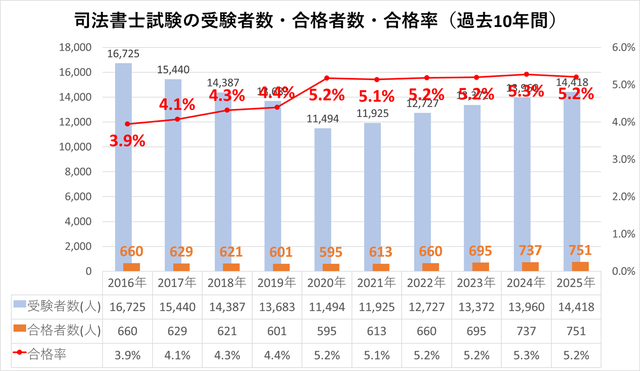 令和7年度の司法書士試験の合格率は、受験者数14,418人に対し合格者が751人で、5.2%でした。過去5年間の合格率は次のとおりで、毎年5%ほどを推移しています。
