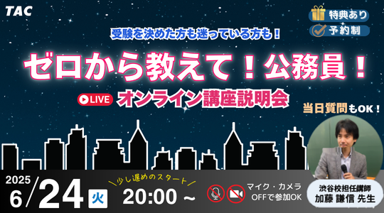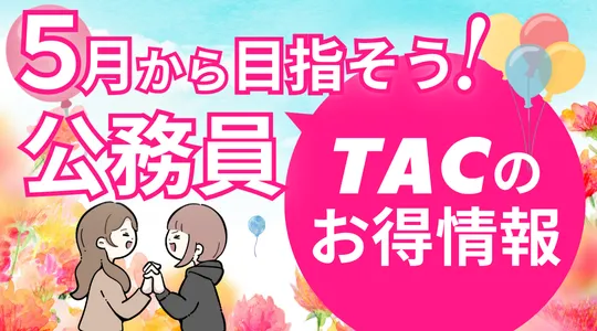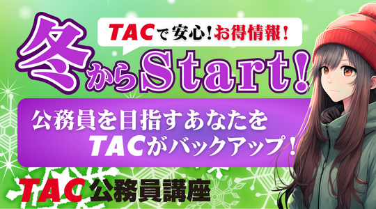- 【TAC池袋校】年末年始特別イベント開催!12/21(日)「狙え!公務員試験上位合格!!~早期スタートが生み出す学習メリット~」担任講師と都庁一般方式最終合格順位2位の方が登壇します!NEW!