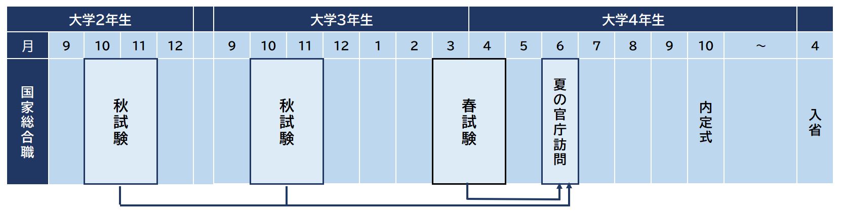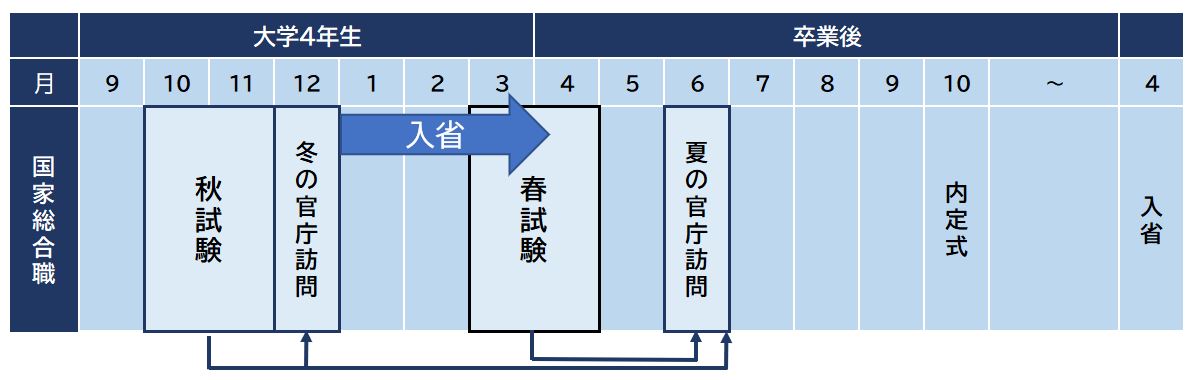- まずは「官庁訪問のチケット」を手に入れるために、春または秋に行われる国家総合職試験で最終合格する必要があります。
