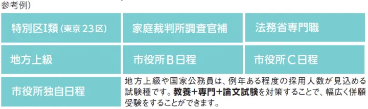 - 教養択一・専門択一・専門記述・論文対策をしておくことで、幅広く併願受験ができます。とくに専門科目が重複する試験については積極的に併願先として検討すると良いでしょう。