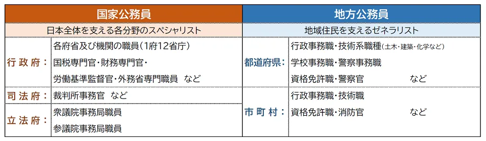 行政府では、国家の中枢で政策の企画立案に携わる国家総合職、各府省庁や地方機関で政策立案を支える国家一般職、この他に国家専門職などがあります。