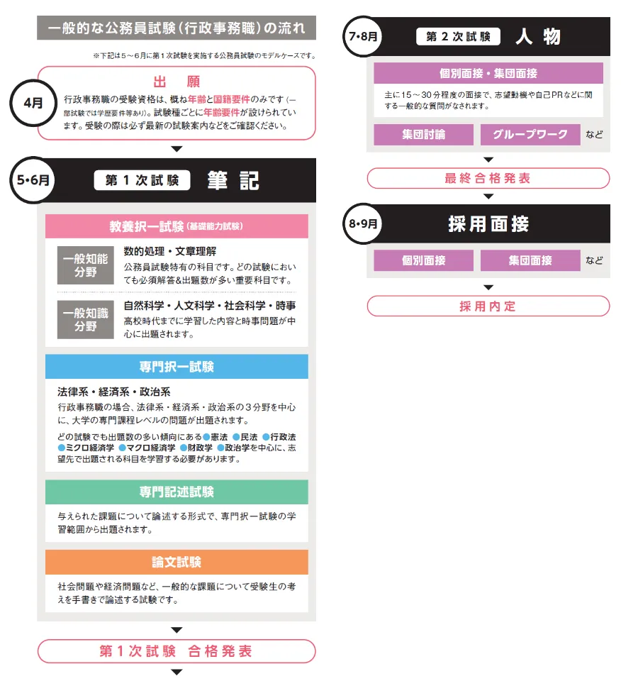 大学4年の4月に出願し、5、6月ごろに筆記試験が中心となる1次試験、7、8月に面接などの人物試験が中心となる2次試験が行われ、2次試験に合格すると最終合格、その後官庁訪問となります。