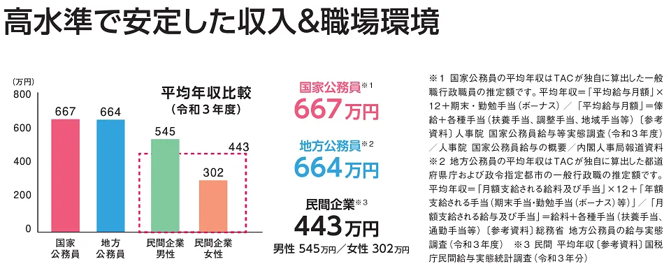 業績や経済動向に大きく左右されやすく、平均年収が400万円代中半で推移している民間企業に対し、国家公務員の平均年収は600万円台中半で推移しており、年収は民間に比べて格段に高い水準となっています。