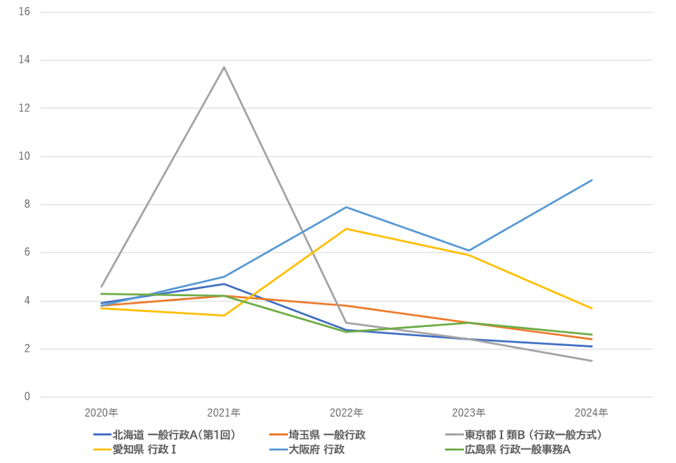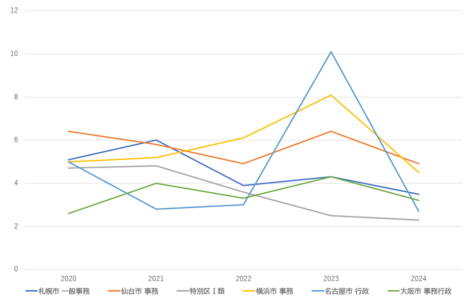 | 広島県 行政一般事務A | 4.3 | 4.2 | 2.7 | 3.1 | 2.6 |