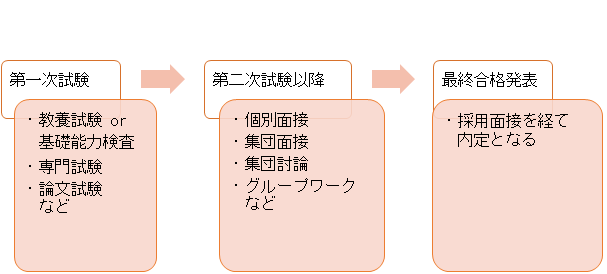 地方公務員試験(大卒程度)は第1次試験と第2次試験以降に分かれ、第1次試験は筆記試験、第2次試験以降は面接が実施される場合が多いです。