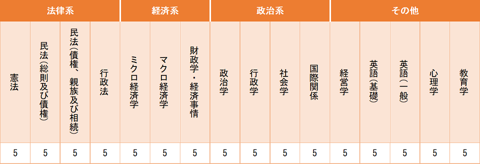 専門試験は、法律・経済・政治科目などの大学で学習する科目が中心になります。