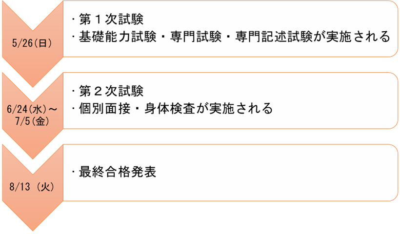 国税専門官試験は第1次試験と第2次試験に分かれ、第1次試験は筆記試験、第2次試験は個別面接と身体検査が実施されます。