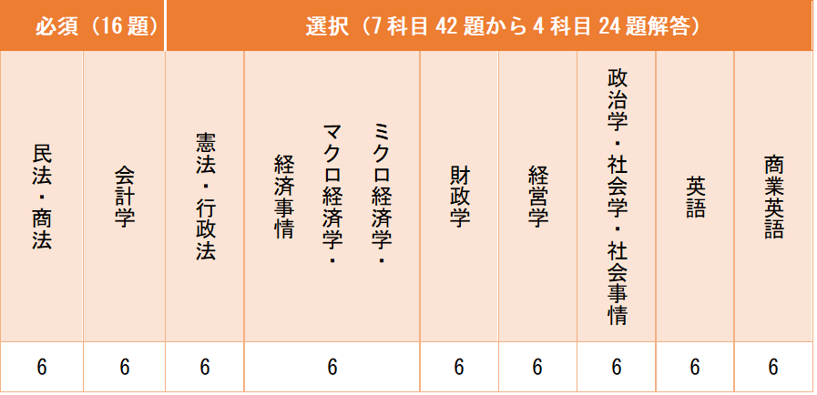 憲法、民法、経済学、会計学、社会学の中から1科目選択して解答します。