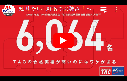 TAC公務員講座の合格実績が高いワケ。今回は、そのワケを支える“6つの強み”と“TACの2次対策”を公開いたします。動画は全部で7つ。 なぜ毎年TAC公務員講座で多くの公務員試験(大卒レベル)の最終合格者を輩出することができるのか、ぜひそのワケを知ってください。さらに合格者に集まっていただき座談会を開催。合格の秘訣を色々と語っていただきました。気になるテーマをご覧ください。