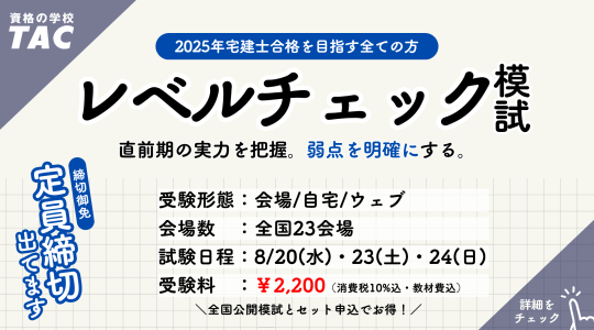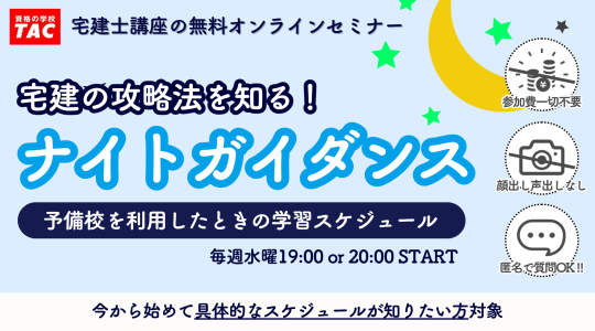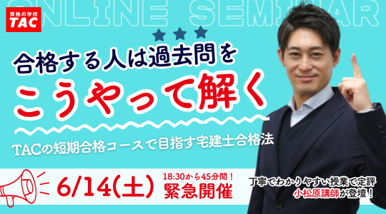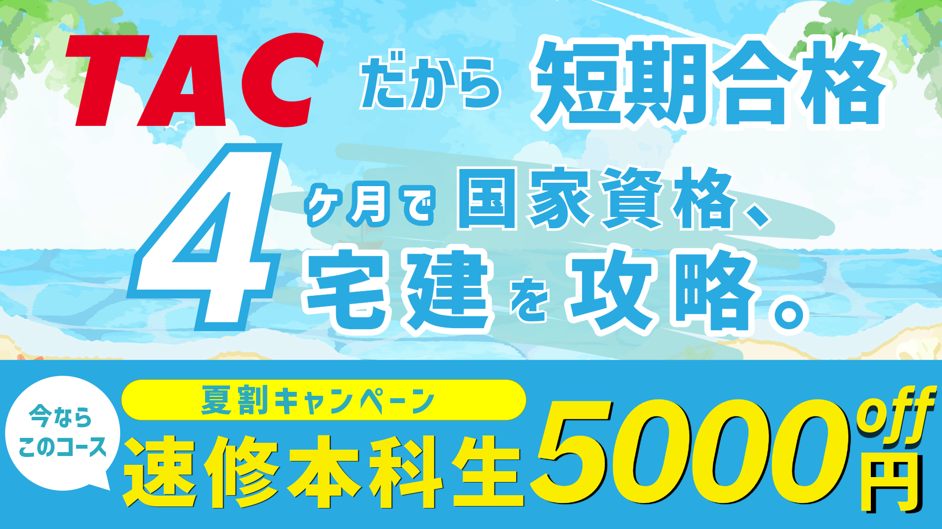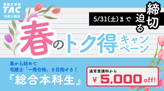 • TAC宅建士講座総合本科生SPlusのカリキュラムにおける回数。講義総回数とは総合本科生SPlusのカリキュラムに含まれる入門講義3回、基本講義26回、解法テクニック講義4回、直前対策講義7回の合計を指し、答練・模試の総回数とは総合本科生SPlusのカリキュラムに含まれる過去問答練13回、基礎答練4回、直前ハーフ答練3回、直前答練4回、全国公開模試1回の合計を指しています。