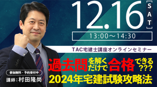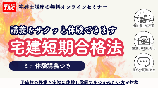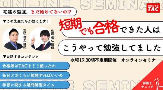 ・TACのカリキュラムは、理解が難しい民法から始め、宅建業法や法令上の制限など暗記科目を順に学ぶ構成で、民法の苦手意識を克服できました。また、教材では「トレーニング」が特に役立ち、徹底的に取り組むことで試験に直結する知識を効率的に習得できました。(2024年度合格者 T.Rさん)