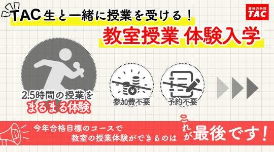 通うスクールの候補はいくつかありましたが、初めて体験講座に出席したのがTACで、その時の講師(辰巳先生)の授業がとても内容、テンポ共に良く、自分に合っていると思った為、即決しました。