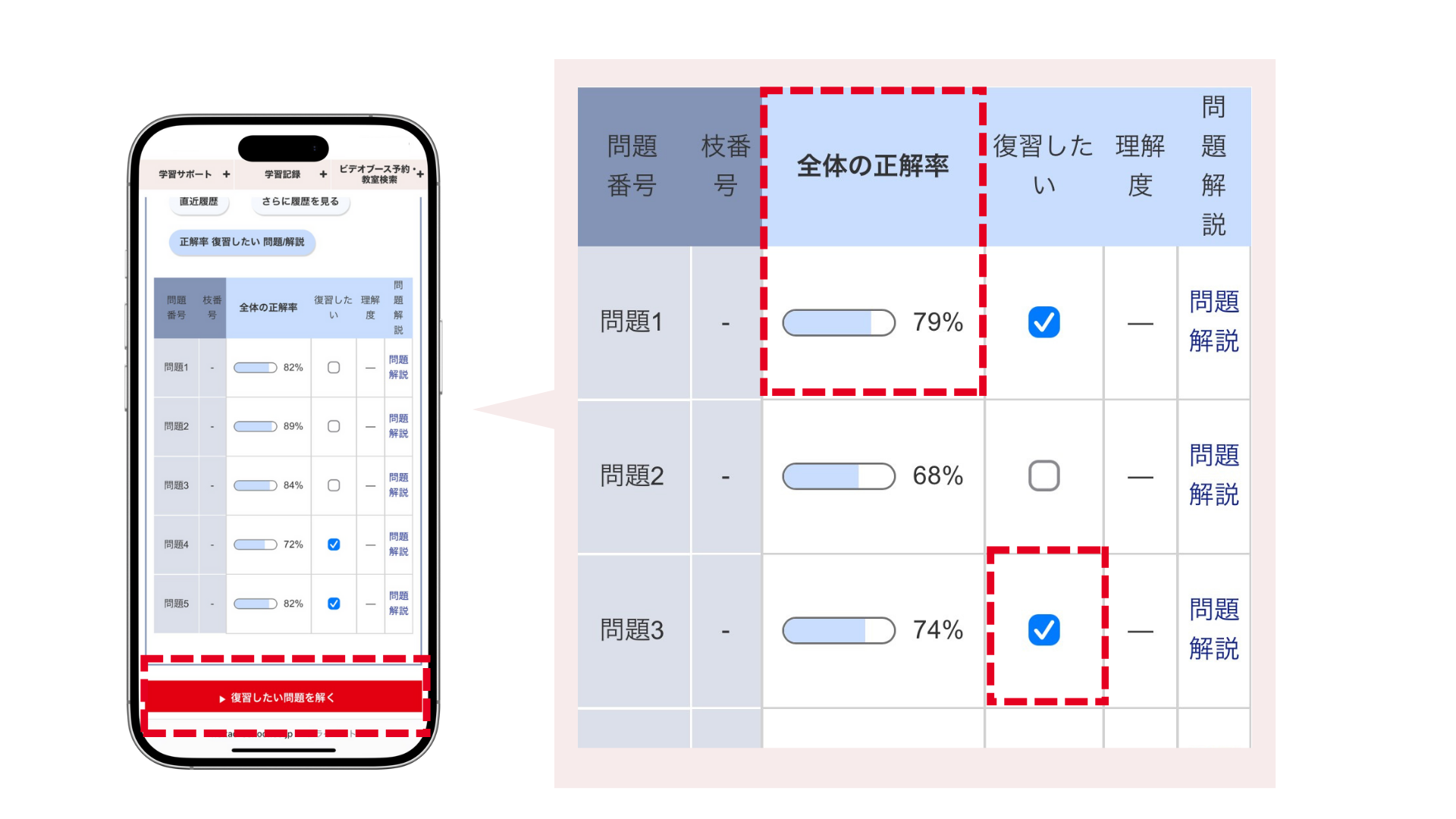 TACの過去問題集を全問収録しています。また復習したい問題にチェックをつけて後でまとめて解くことも可能です。さらに利用者全体の正答率も可視化され、多くの受講生が正解している「落としてはいけない問題」が一目でわかります。スマホ1台で通勤・通学時間や寝る前の10分でも!スキマ時間の活用が合格へのカギとなります。