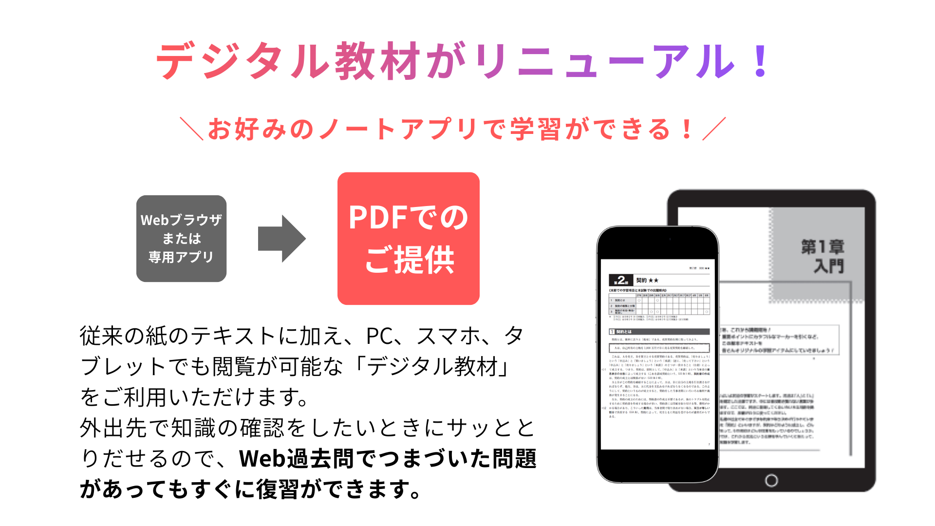 - 従来の紙のテキストに加え、PC、スマホ、タ ブレットでも閲覧が可能な「デジタル教材」 をご利用いただけます。2種類の教材を使い 分けることで、効率的・効果的な学習をさら に加速させます。学習環境の向上に、ぜひ お役立てください!