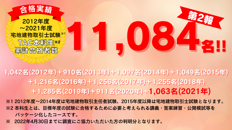 私は宅建業界にも全く携わっていない初学者でしたが、約1年間の地道な学習とTACのサポートにより無事合格することができました。 本試験に合格することは1つのゴールではあるものの、結構先が長いのでモチベーションが下がるかもしれませんが、そんな時は「次のミニテストで100点取る」とか「次の基礎答練では上位○位に入る」等、短いスパンでの目標設定をすることでモチベーションアップを図ることも効果的だと思います。