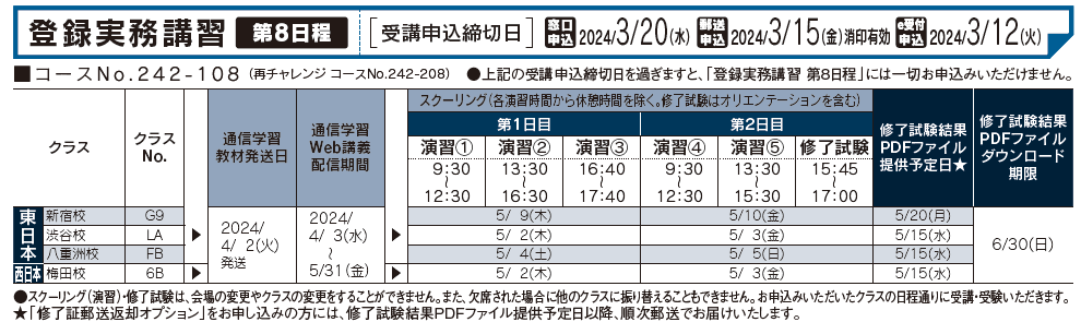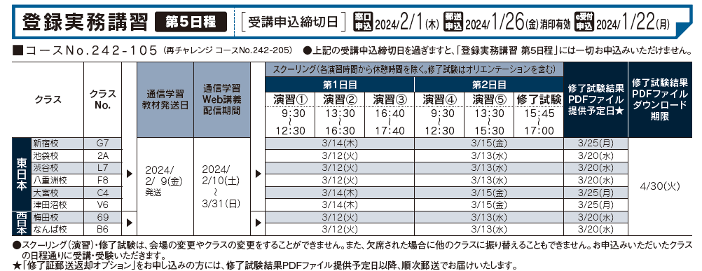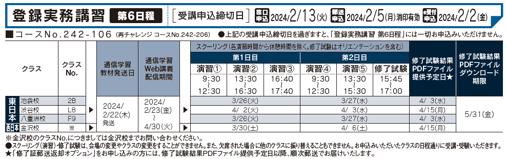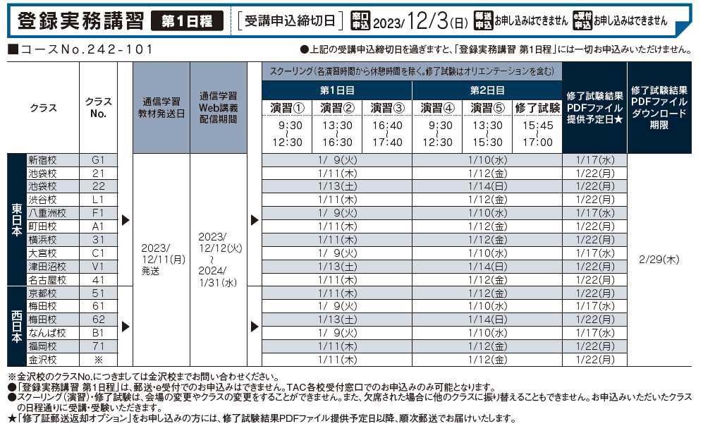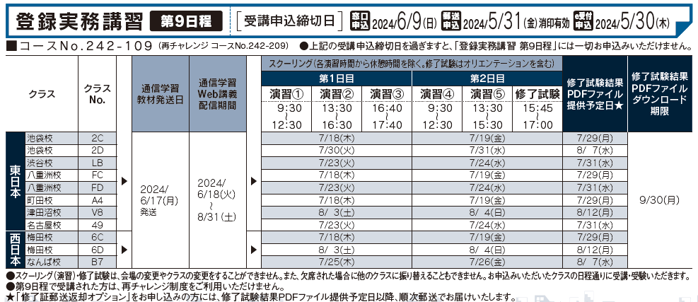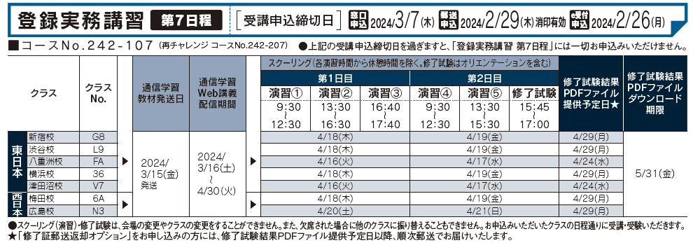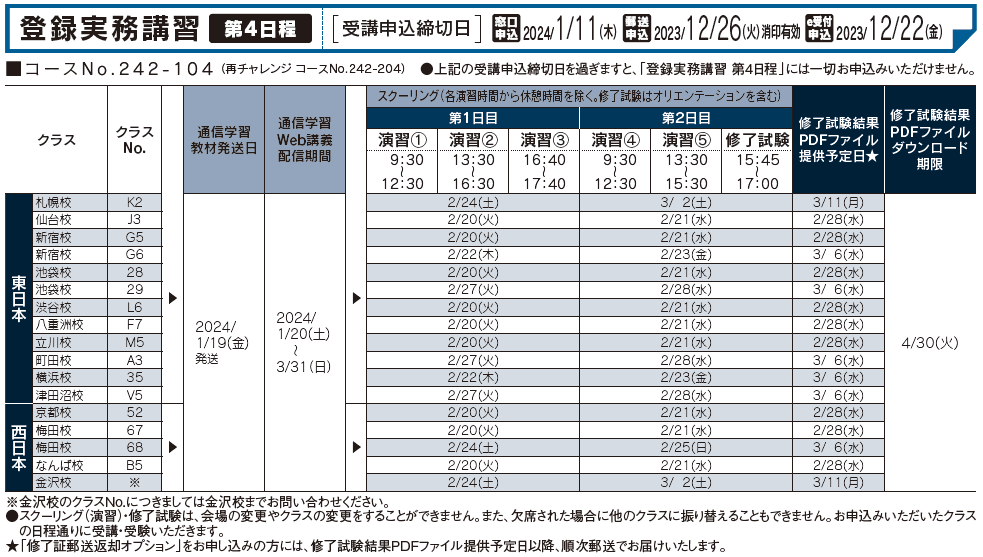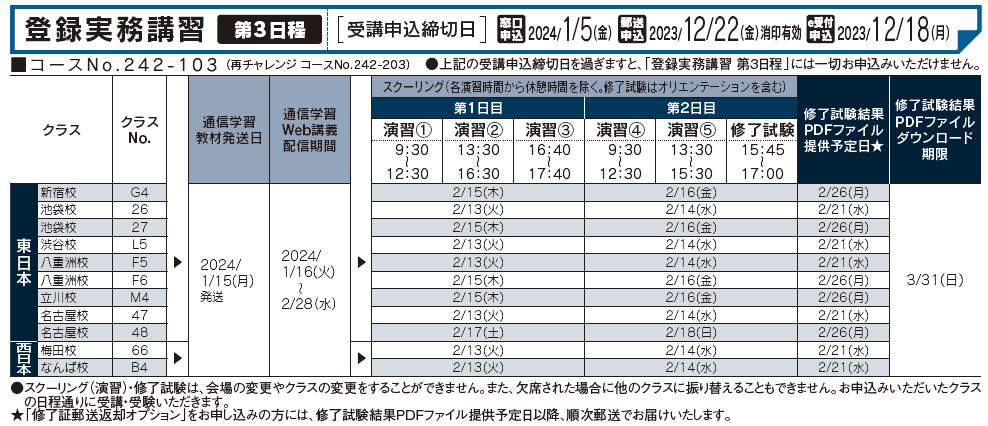 演習・修了試験は、会場の変更や途中からのクラスの変更をすることはできません。また、欠席された場合に他のクラスに振り替えすることもできません。お申込みいただいたクラスの日程どおりに受講・受験いただきます。