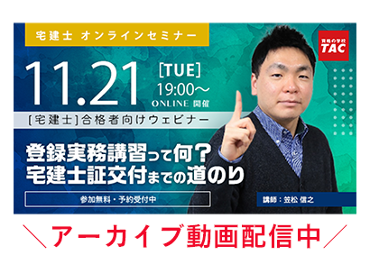 宅建士試験合格後もTACにお任せください!宅建試験合格者で宅建業の実務経験が2年未満の方が資格登録をするために必要な講習です。当講習は定員制のためお申込みはお早めに!