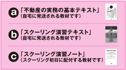 通信学習教材としてお送りする「不動産の実務の基本テキスト」「スクーリング演習テキスト」「スクーリング演習資料」「確認テスト」「受講ガイド」も必ずご持参ください。