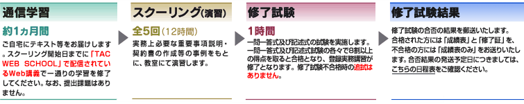 TACの登録実務講習は国土交通省令に基づき「通信学習」及び「スクーリング(演習)」によりおこないます。なお、通信学習・スクーリング(演習)実施後「修了試験」をおこない、一定水準をクリアすることで「講習修了」となります。
