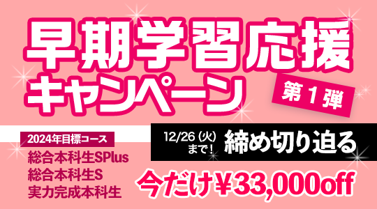 期間限定で無理なく確実に合格が狙える初学者対象の「総合本科生S」または学習経験者・受験経験者対象の「実力完成本科生」が大幅割引価格でお申込みいただけます!