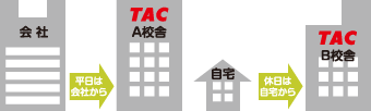 例えば、平日は会社や大学近くのTACで、休日は自宅近くのTACで等、自由な振り替えが可能です。