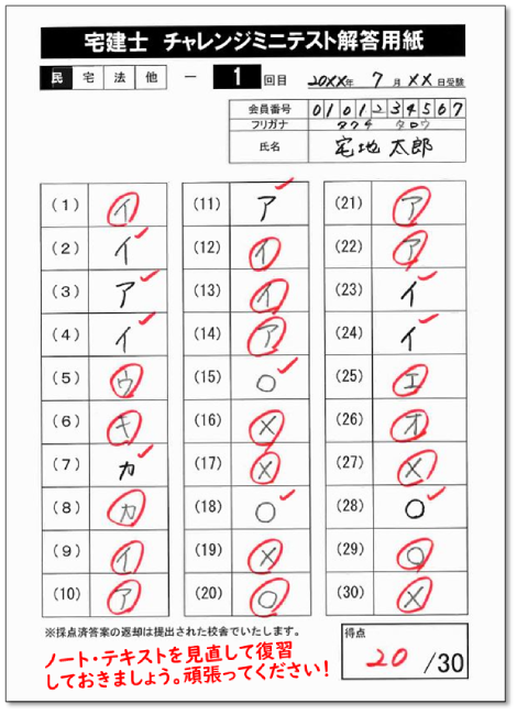 毎回の講義で実施されるミニテストは、講師が採点して返却します(教室講座のみ)。1つ1つの「できた」を積み重ねて、実力と自信を身につけていきましょう。
