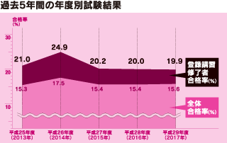 以下の図は、過去5年間の宅建試験における合格率を表したものです。注目すべき点としては、全体の合格率に対して、登録講習修了者の合格率が高いということです。5問免除により、令和5年度試験では全体合格率よりも3.3パーセントも高くなっています。