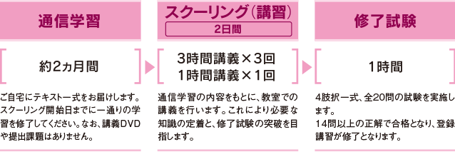 TACの登録講習は国土交通省令に基づき「通信学習」及び「スクーリング」によりおこなわれます。なお、通信学習・スクーリング実施後に「修了試験」をおこない、一定水準をクリアすることで「講習修了」となります。