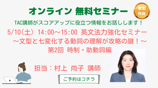 テスト受験直前に知っておくとすぐに得点アップにつながる攻略テクニックを知る【短期集中ゼミ】 。TAC講師陣によるオンラインセミナー11タイトルが受講期間中見放題のWeb通信講座【オンラインセミナー動画ライブラリー】 。公開テストと通常同等に評価されている【TOEIC® L&R IPテスト】。