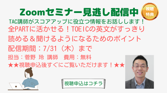 - 【12/21(日)14:00-15:00 IIBCxTAC共催オンラインセミナー】TOEIC® Program運営団体のIIBCが直接解説!データで見るTOEIC® L&R TEST 最新事情セミナー ―TAC講座説明会付―詳細・予約はこちら