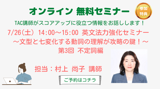 - 【ライブ配信 12/21(日)14:00-15:00 IIBCxTAC共催オンラインセミナー】TOEIC® Program運営団体のIIBCが直接解説!データで見るTOEIC® L&R TEST 最新事情セミナー ―TAC講座説明会付―詳細・予約はこちらNEW!