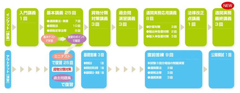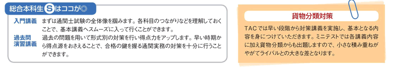 TACでは、基本講義実施時に配布されるミニテストにおいて講義範囲とは別に「貨物分類」についても出題します。また、基本講義終了後は、貨物分類対策講義を設けており、合否の分かれ目といわれる「貨物分類」に関して早い時期から対策をおこなうことができます。