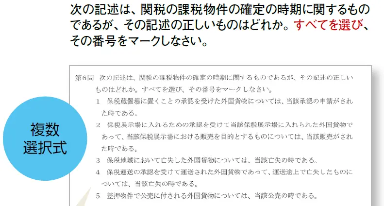 ですが、通関士試験には「択一式」「語群選択式」「複数選択式」「申告書作成」など様々な形態の問題が出題される点に注意が必要です。それぞれの特徴と対策法をご紹介します。