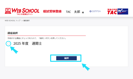 サイトへ遷移したら、模試の登録を行う「講座」「コース」にチェックを入れ、”選択”をクリックしてください。