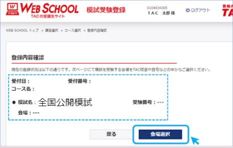 登録を行う模試をご確認いただきましたら、”会場選択”をクリックしてください。