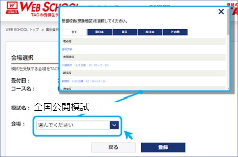 教室講座・ビデオブース講座・Web通信講座・オンラインライブ通信講座とも対象になります。受験地は、模試受験登録手続の際、自由に選択いただけます。
