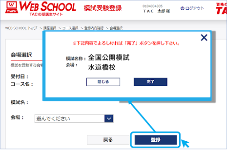 △受験会場を選択したら、“登録”→“完了”とクリック。