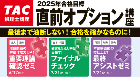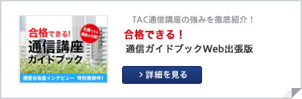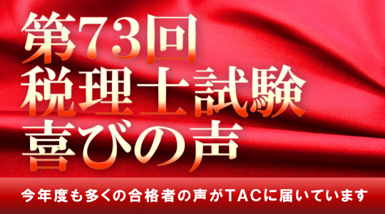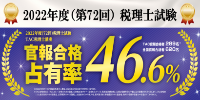 • TAC合格者とは、TACにおいて合格するための講義、公開模試等がすべて含まれたコースで、税理士試験合格に必要な受験科目の半数以上を受講された方を対象としています。TAC合格者には、直前対策講座のみの受講生、公開模試のみの受講生、出版教材のみの購入者、資料請求者、情報提供のみの登録者、無料の役務享受者は一切含まれておりません。