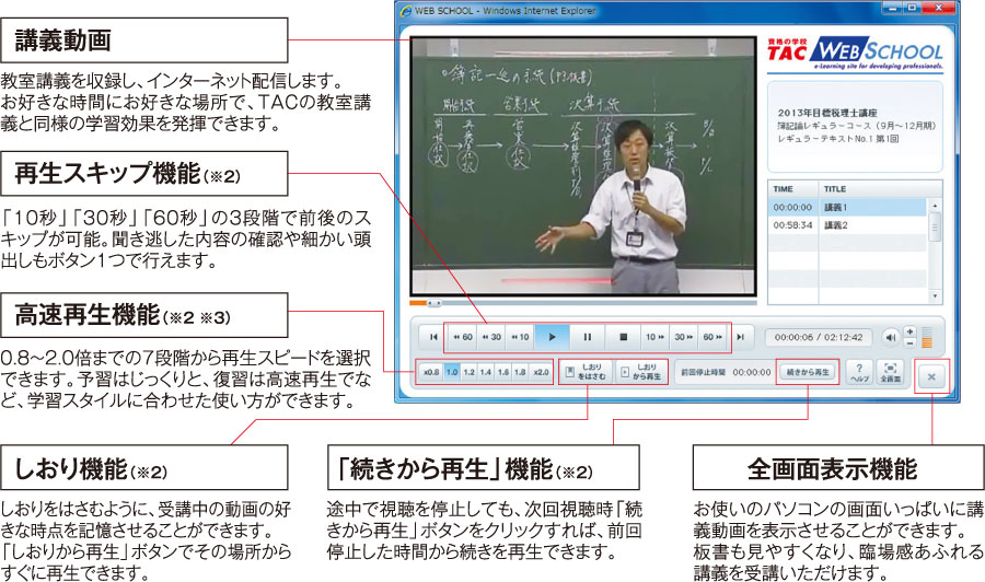 Windows®, Mac®はもちろん、スマートフォンやタブレット端末でも速度変更が可能なので、講義の視聴時間を短縮でき、さらに効率的な学習が可能になります。その他、効率的に学習を進めるための機能が充実!